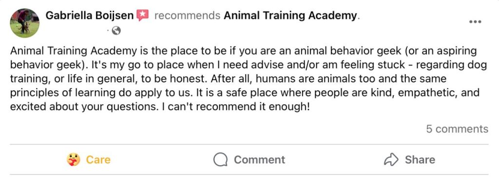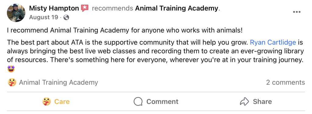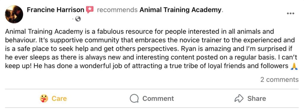 Vibrant, Supportive Community: The Heart of Our Learning Experience: At the Animal Training Academy, our community is a central part of the learning experience, offering a dynamic and supportive environment for all members. Our dedicated Facebook group and website forums serve as vibrant platforms for interaction, where members can connect, share experiences, and offer support. In these spaces, you can ask questions, receive feedback from both peers and experts, and engage in discussions on a wide range of animal training topics.