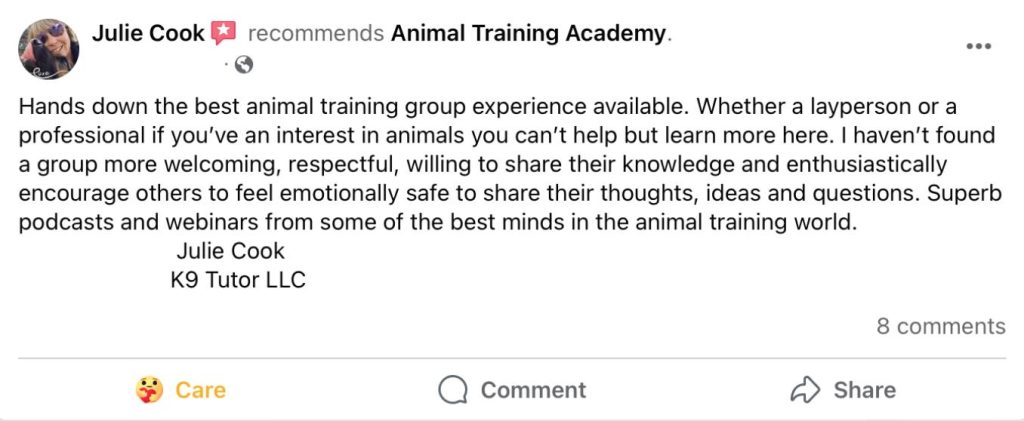 "I love everything about Animal Training Academy, It’s just such a good way to meet and connect with other trainers.”